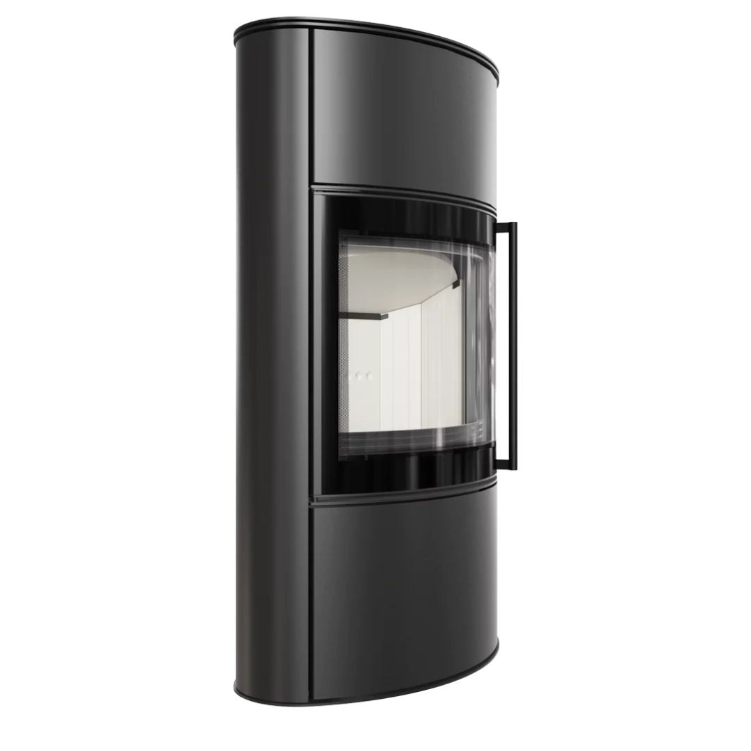 The Kratki Bjorn W fireplace, a statement-freestanding wood fireplace blending Scandinavian elegance with modern heating performance. With its expansive panoramic glass door, sleek steel body, and subtle soft-close handle mechanism, the Bjorn W delivers both visual impact and functional warmth in stylish interiors.