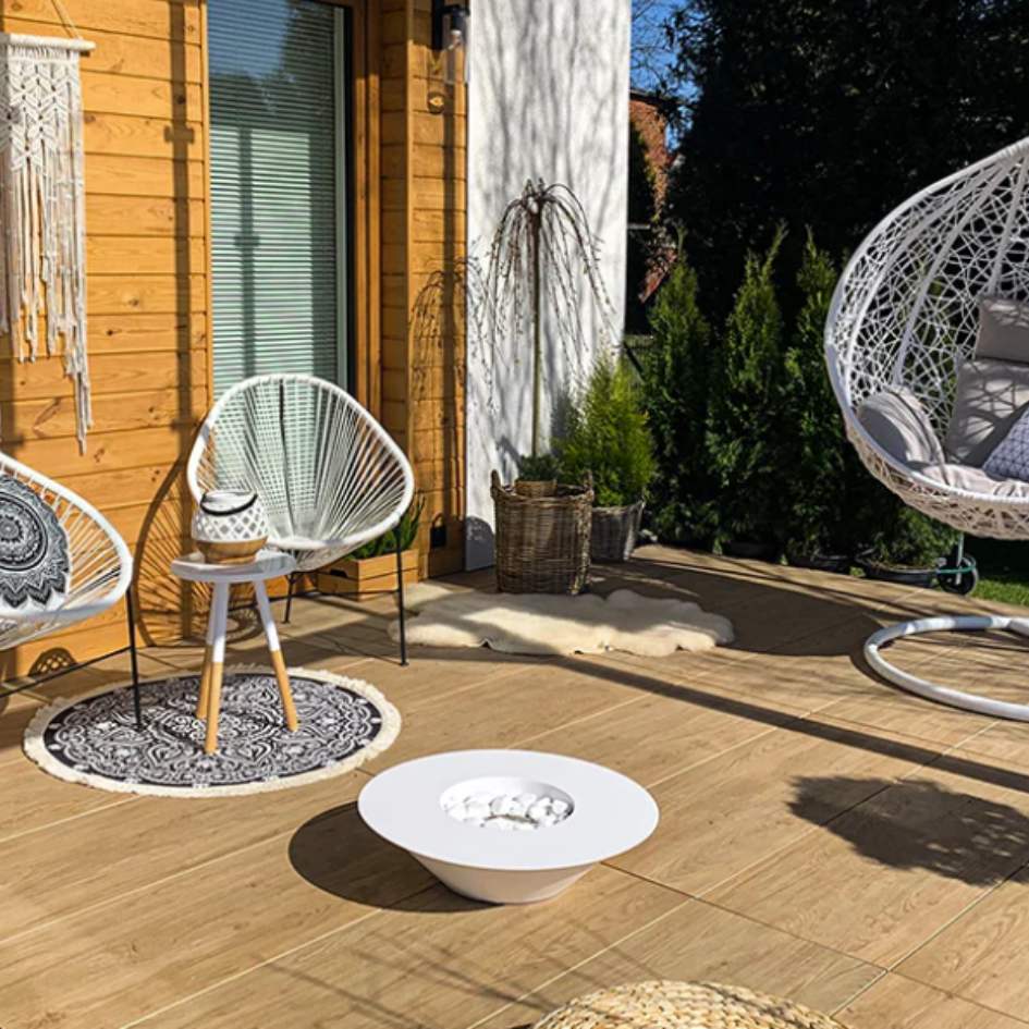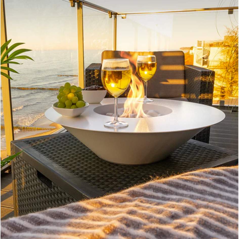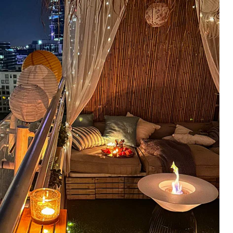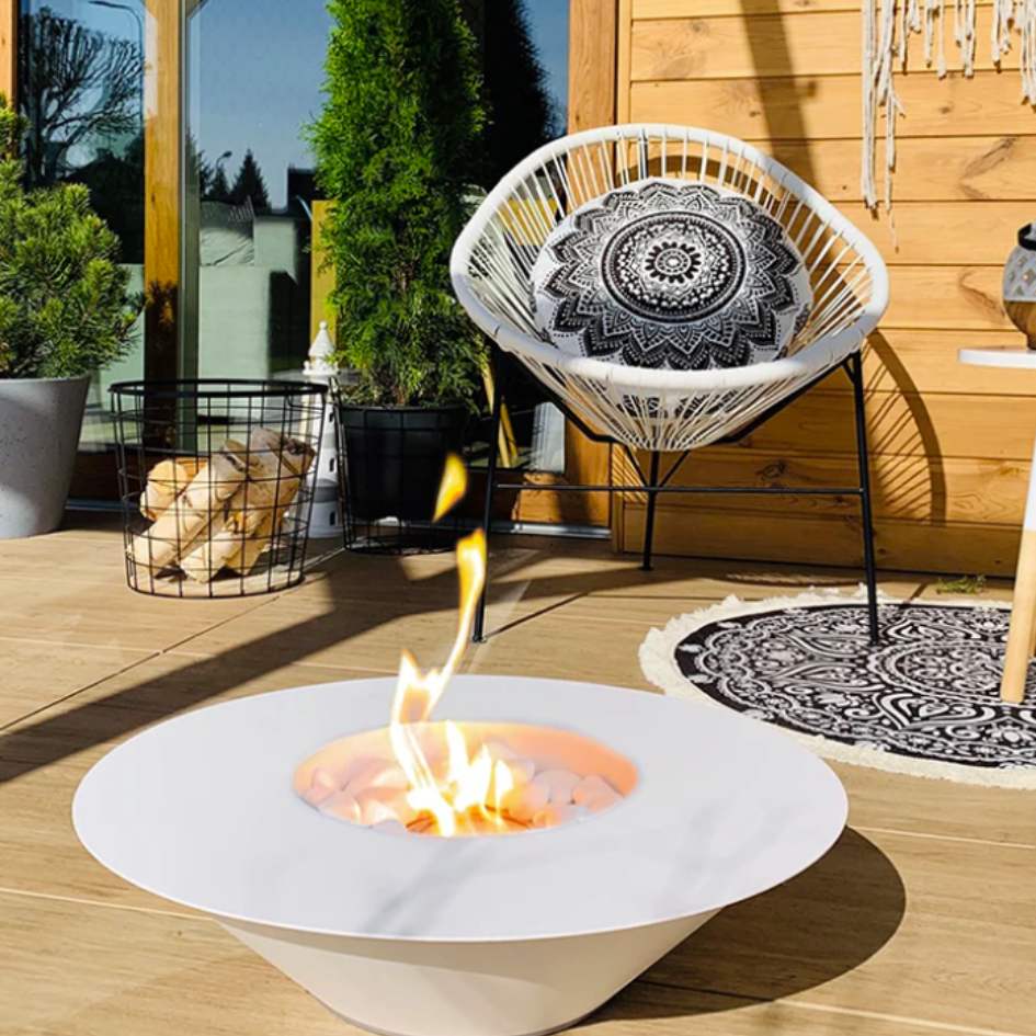 The NovaFlame Freestanding Universe Biofuel Fireplace can be moved around and positioned on your patio or living and dining room.